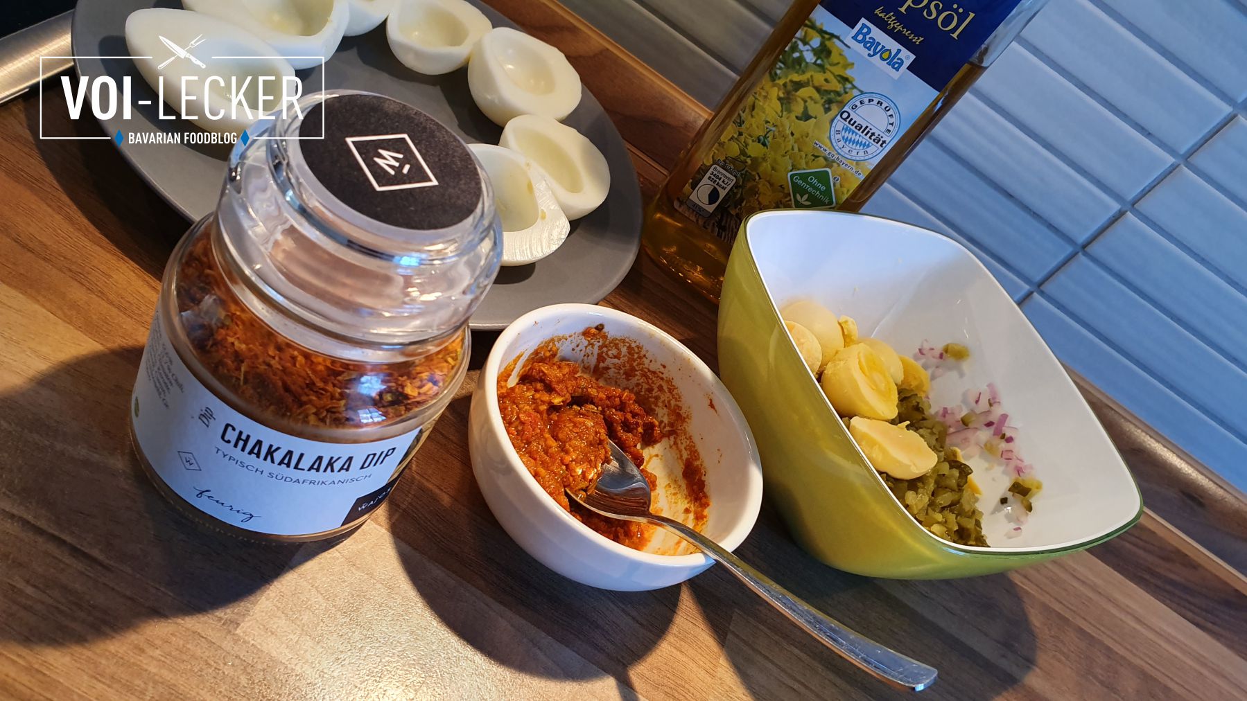 Zuerst natürlich die Eier hart kochen und abkühlen lassen. Am besten am Vortag. Eier schälen, halbieren, Eigelb raus heben und in eine Schüssel geben. Zwiebel, Knoblauch, Essiggurken und Kapern so klein würfeln wie´s geht und zu dem Eigelb geben. Den Senf, einen Spritzer Zitronensaft, etwas geriebenen Ingwer, die Chakalaka Gewürzmischung und das Rapsöl dazugeben und alles mit einer Gabel gut zerdrücken bzw. mischen. Mit etwas Pfeffer und evtl. Salz abschmecken.
