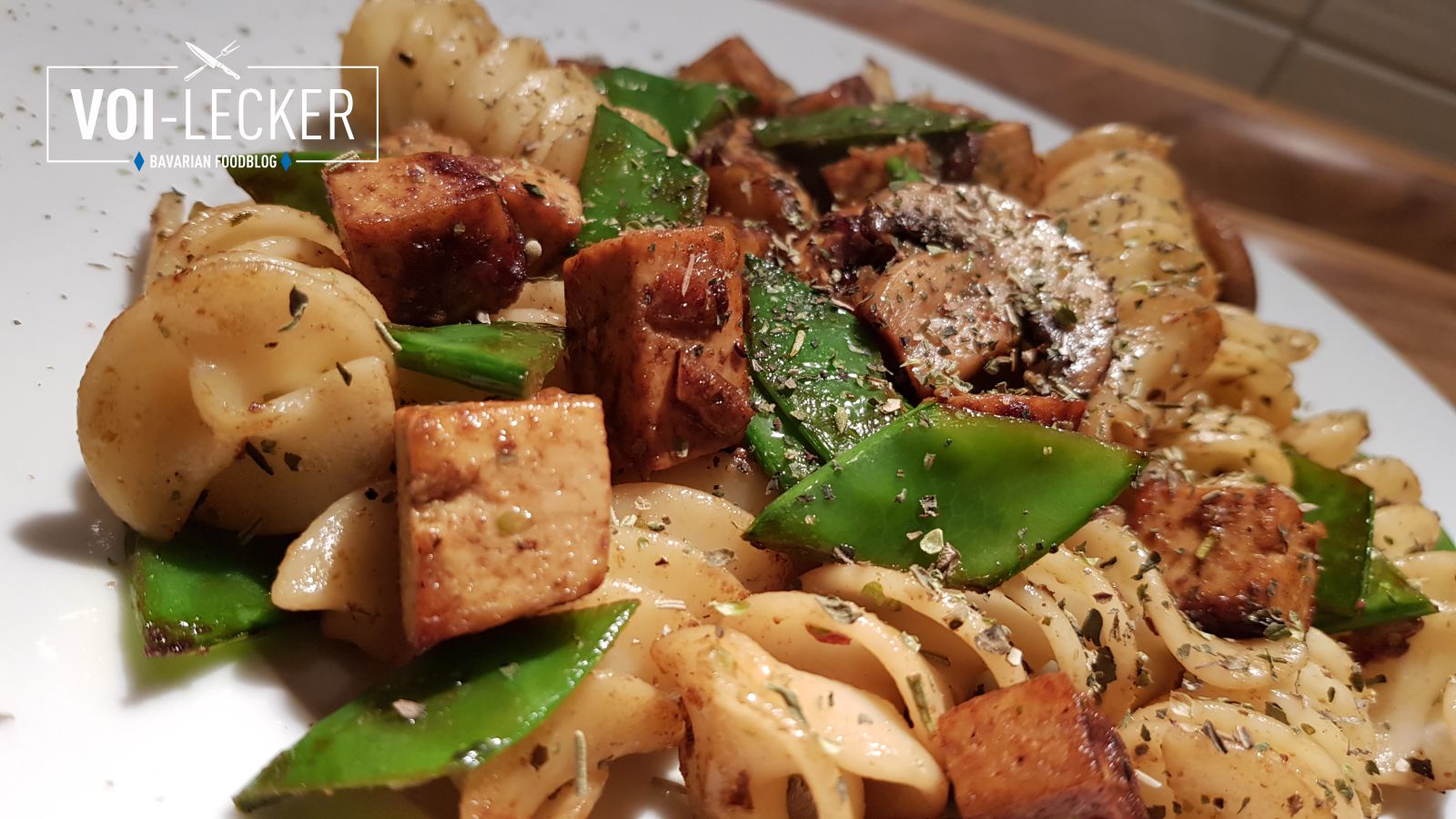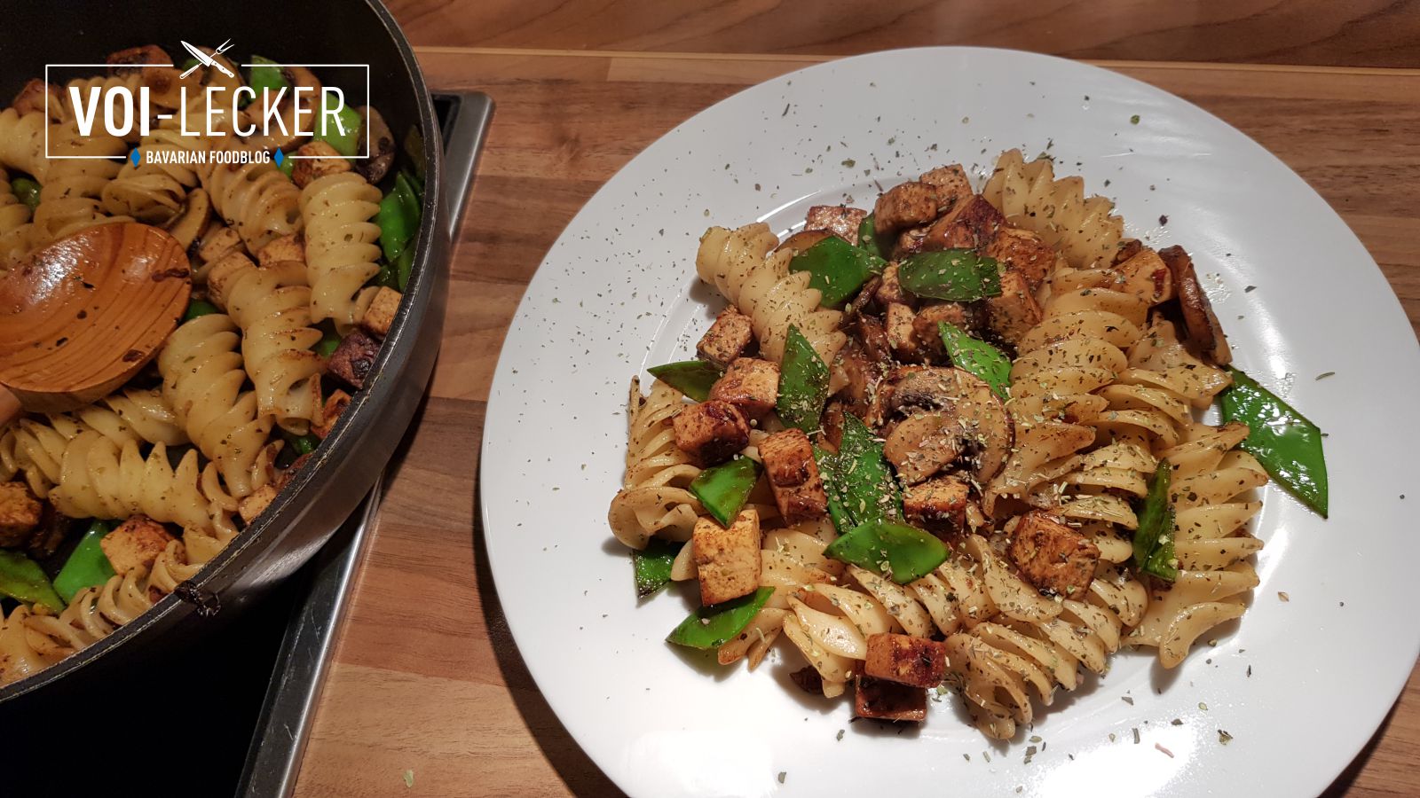 Die Fussolini nach Packungsanleitung bissfest kochen. Währenddessen Champignons und Zuckerschoten in Streifen schneiden. Schalotten, Knoblauch und Ingwer klein hacken und in etwas heißem Olivenöl glasig anbraten. Jetzt gleich die marinierten Tofu Würfel dazu geben und etwa 3-4 Minuten mitbraten. Die Champignons und Zuckerschoten dazu geben und weitere 3-4 Minuten braten. Mit der Sojasauce und einem Spitzer Zitronensaft ablöschen und die gekochten Fussolini unterheben.