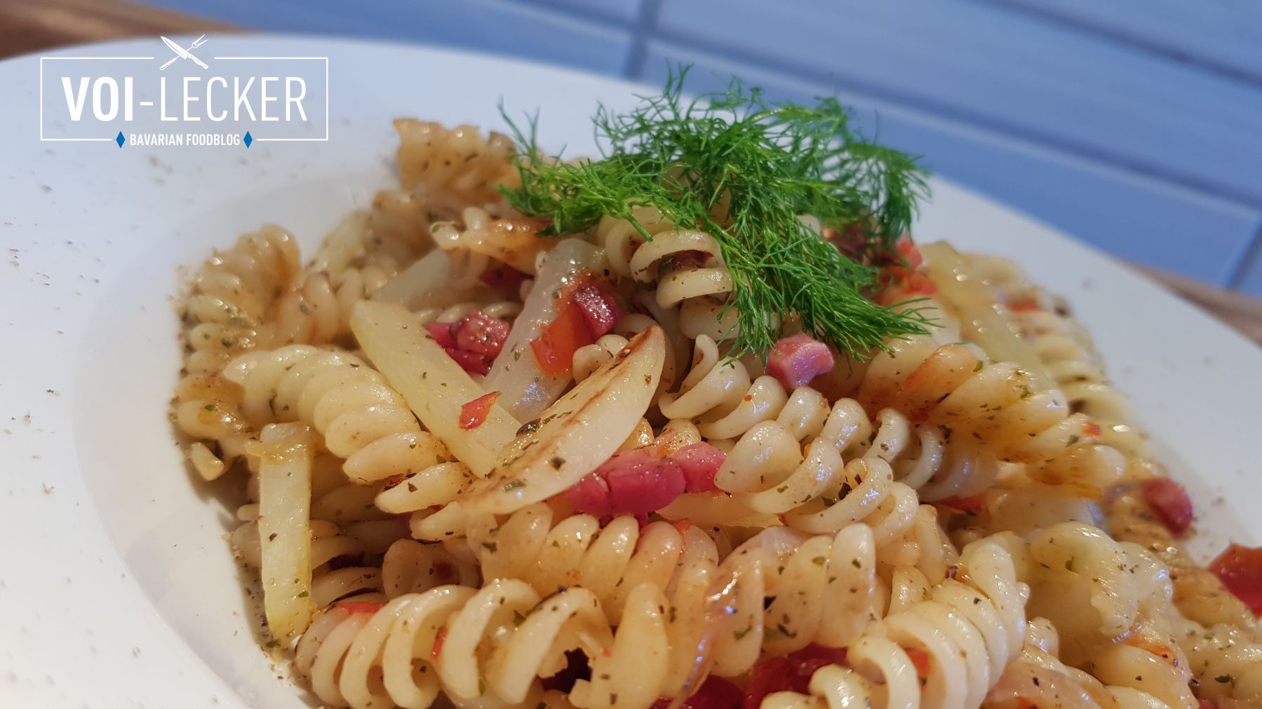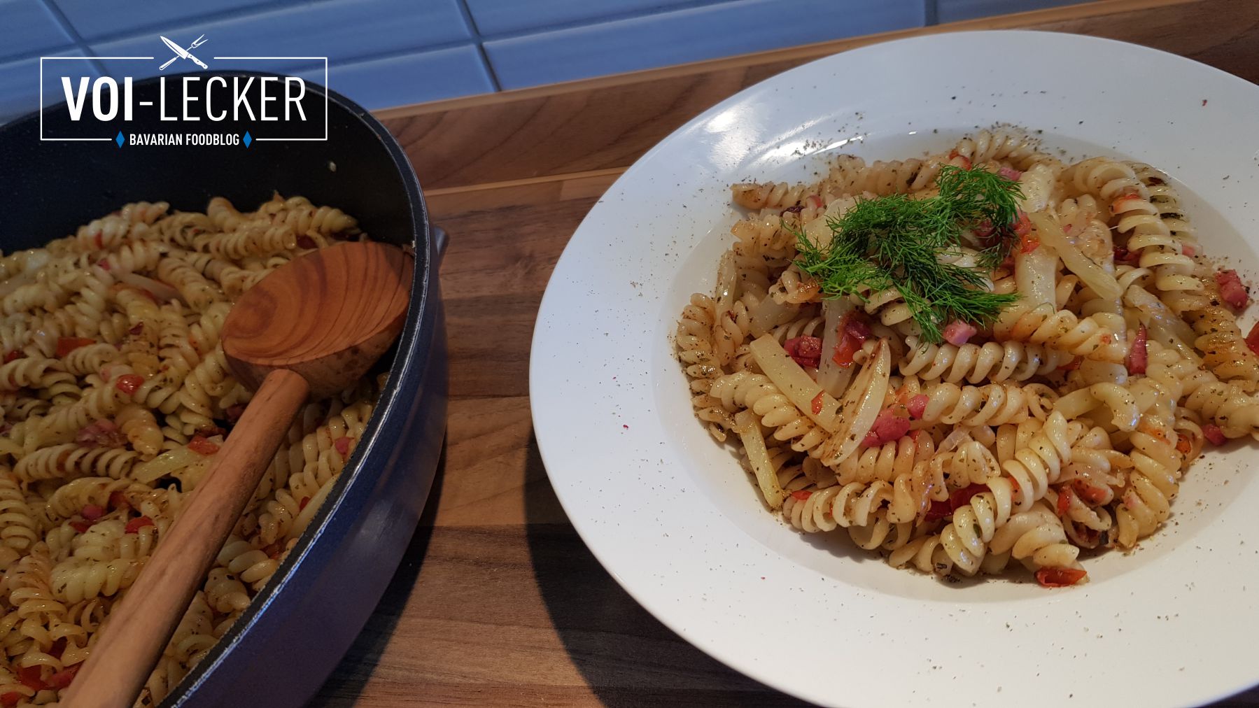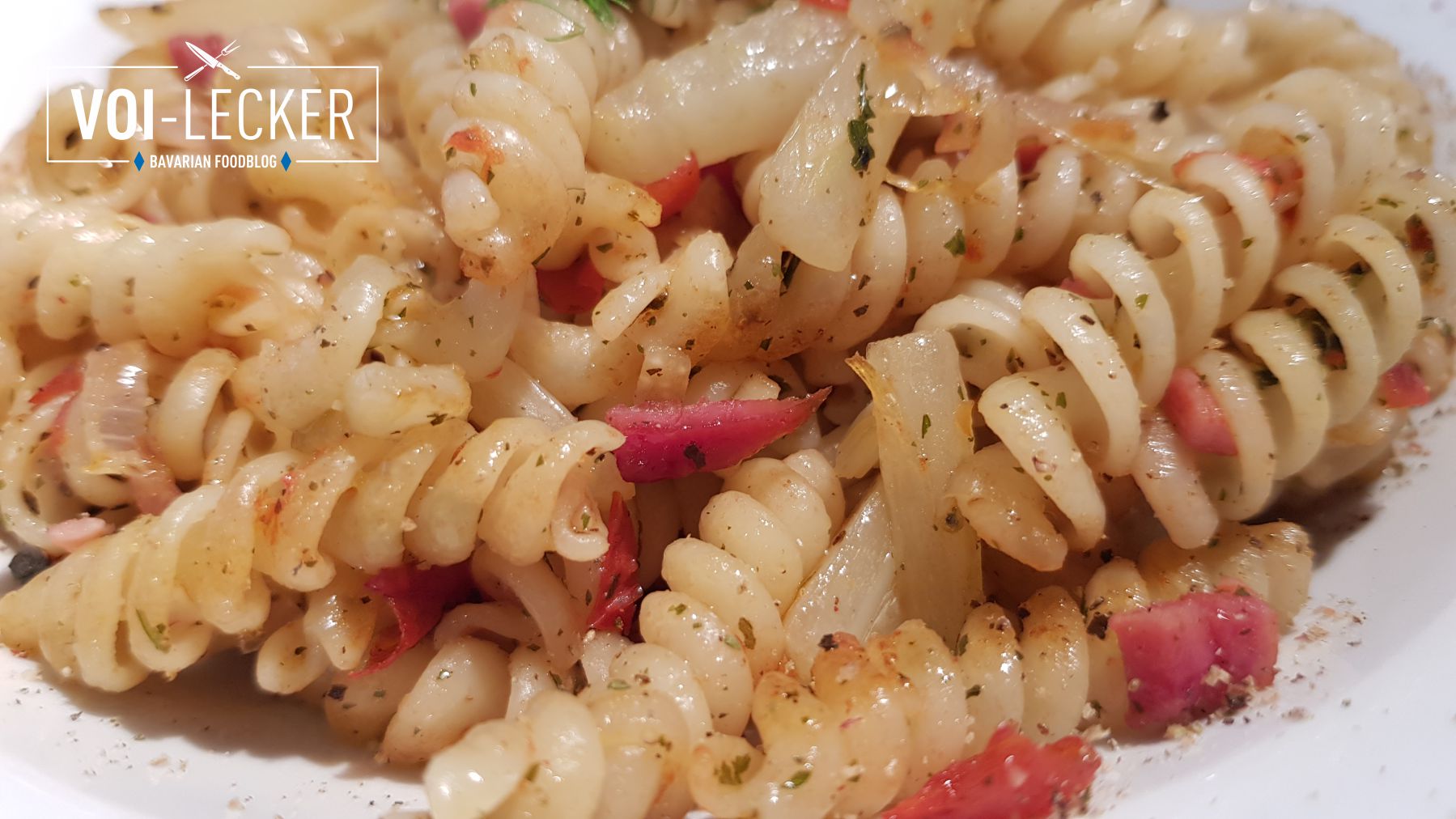 Gebratene Nudeln gehen eigentlich immer. Heute hab ich dazu mal Girandole Pasta verwendet. Girandole heißt übersetzt „Windrad“ und sind im Grunde kleine „Schraubennudeln“. Ich persönlich finde diese Pasta Sorte durch ihre Form perfekt für gebratene Nudelgerichte. Sie bieten einfach eine sehr große Oberfläche für viel Geschmack. Zu gebratenen Nudeln passt natürlich Schinken optimal. Ich habe das diesmal mit Fenchel und Tomatenstückchen geschmacklich optimiert.
