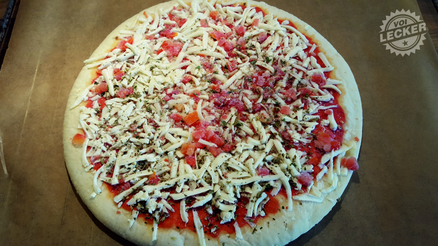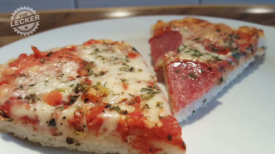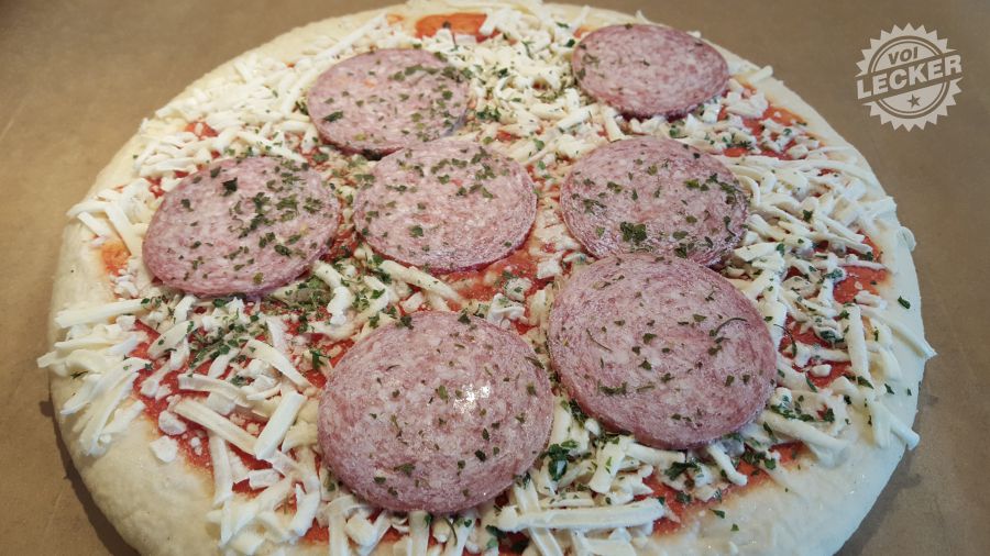 Die Zutaten der Salami Pizza sind fast identisch, nur halt mit zusätzlich Salami, weniger Mozzarella etc.