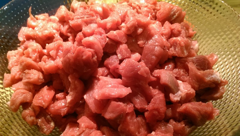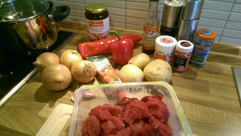 Als Erstes is a Menge an Schnippelei angesagt. Also die Zwiebeln und die Knofizehan schälen und würfeln, zur Not gang a Hacken. Dann kann man auch gleich die (natürlich gewaschene) Paprikaschotten putzen und ebenfalls in Würfel schneiden. Die Kartoffeln könnt man zwar auch jetzt gleich würfeln aber dazu ist später noch Zeit weil de Kartoffelwüfel erst später dazu kommen. Jetzt ist des Fleisch dran: Dieses auch klein schneiden, allerdings ned zu klein – de derfan schon a guade Fingerdicke haben, also so 3-4cm. OK des war jetzt eigentlich schon die meiste Arbeit.
