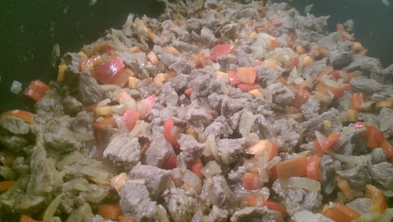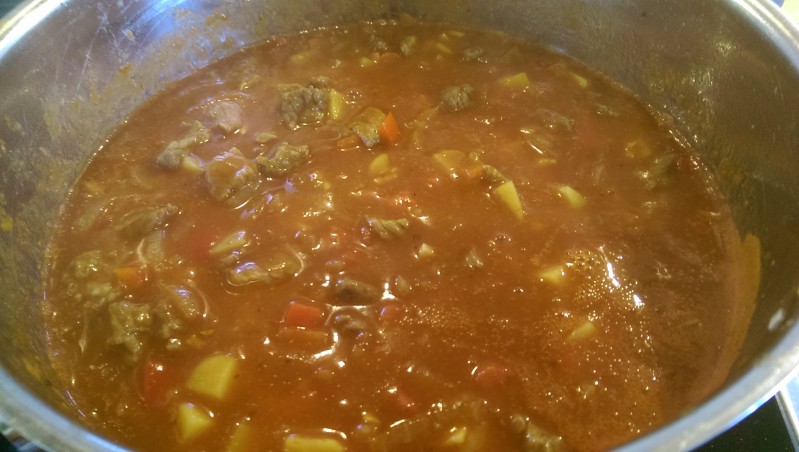 Jetzt geht´s an den Topf. As Schmoiz (oder´s Öl) in an Topf erhitzen und do drin dann de Zwiebeln andünsten bis scha fast braun san. Oba nur FAST! Is des soweit dann de Rindfleischstückl zu de Zwiebeln geben und a bisserl mit schmoren. Aber bitte nicht mit zu vui Hitz damit s Fleisch a schön zart bleibt. Hin und wieder umrühren und sobald kein Fleischstück mehr rot/roh erscheint kommen guade 3 Esslöffel Paprikapulver zusammen mit dem Knoblauch, Majoran, Thymian und Kümmel mit in den Topf. Kurz mitdünsten. In Wien sogt ma übrigens „paprizieren“ do dazua. Dann nu pfeffern und soizen und 2-3 Spitzer Worcester-Sauce dazu (man kann auch an Weißwenessig nehma oder wer defitig mag – Tabasco) und vor sich hin köcheln lassen. KEIN Wasser, Brühe etc. dazu geben! Das Fleisch und de Zwiebeln geben genügend Flüssigkeit ab.