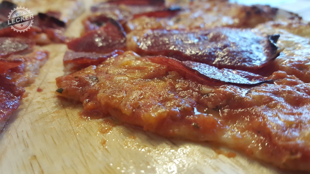 Eine Pizza reicht locker für eine erwachsene Person, es sei denn, man isst, so wie ich, den Rand nicht mit. Dann ist es etwas knapp, weil der Boden so dünn ist (was KEINE Kritik sein soll, der ist genau so, wie er sein muss!!!). Ich muss dazu aber sagen, dass ich meist den Rand im Nachhinein noch „snacke“, weil selbst der so lecker ist 😛