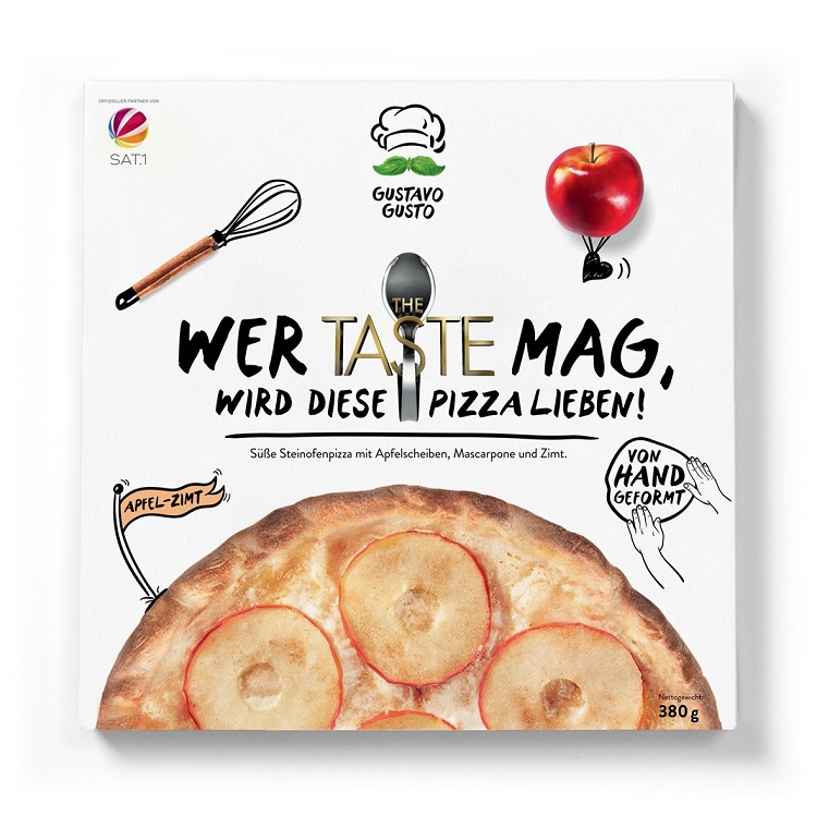 Im Herbst 2019 bringt Gustavo Gusto erstmals eine süße Tiefkühlpizza auf den Markt. Und zwar eine Steinofenpizza, die mit Apfelscheiben belegt und Mascarpone sowie Zimt verfeinert ist.