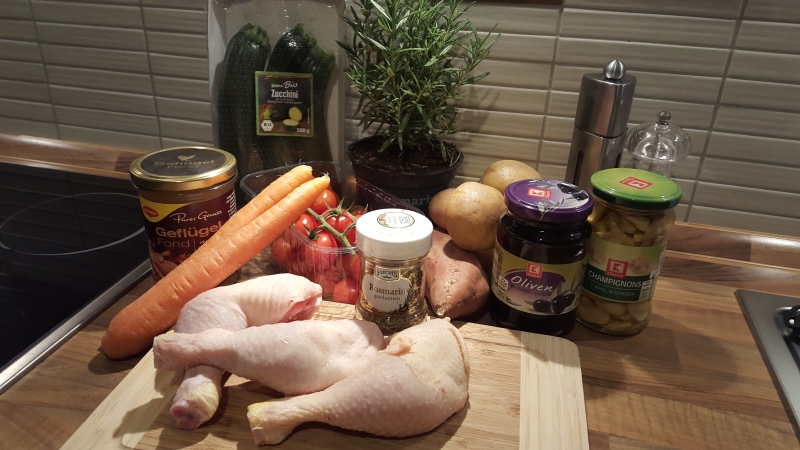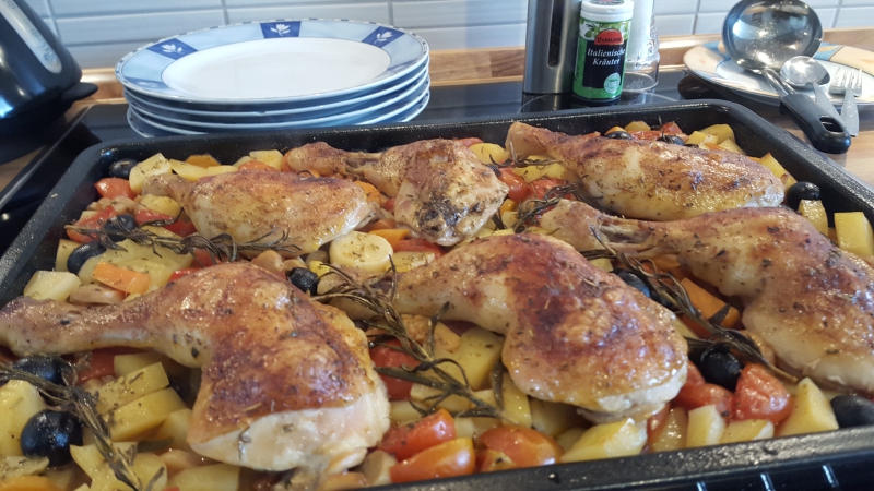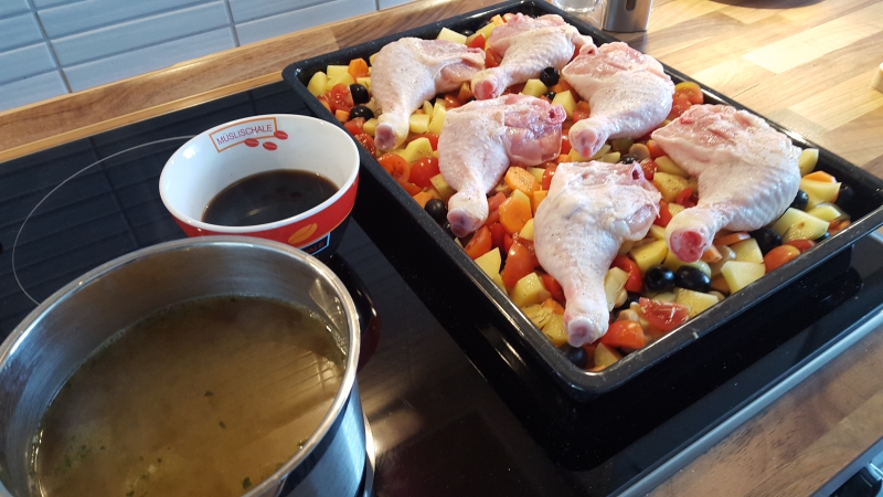 OK, das wars eigentlich schon mit der Vorbereitung. Nun nimmt man ein tiefes Backblech und verteilt darauf die Kartoffel, Tomaten, Oliven, Zucchini und Pilze. Das Gemüse gut mischen, gleichmäßig verteilen und dabei gleich mit Salz und vor allem dem getrocknetem Rosmarin würzen. Anschließend legen wir die Hühnerkeulen auf dieses toskanische Gemüsebett, und zwar (ganz wichtig!) mit der Oberseite nach unten. Nun wird mit einem großen Löffel das Olivenwasser auf die Hühnerkeulen geträufelt und dannach alles mit der heißen Hühnerbrühe übergossen. Auf jeden Fall die ganze Hühnerbrühe drüber giessen, deshalb sollte das Blech schon entsprechend tief sein. Den frischen Rosmarin legt man auf die Keulen und drückt diese leicht an. Dann ab damit in den vorgeheizten Backofen bei 200 Grad Umluft.