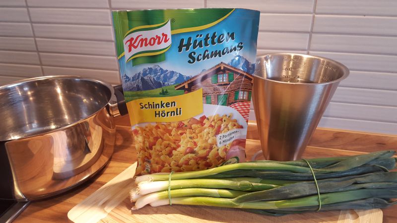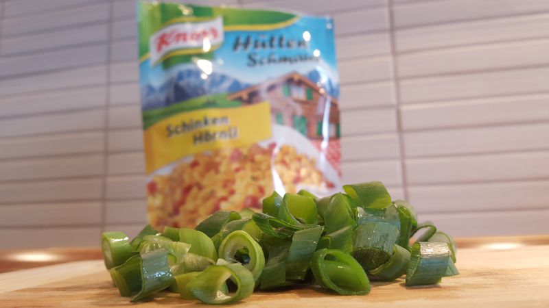 Ach ja, wir müssen natürlich unbedingt erwähnen das wir den „Herzhaften Tipp“ von Knorr (steht auf der Rückseite der Verpackung) befolgt haben und am Schluss frisch geschnittene Frühlingszwiebel zu dem Hüttenschmaus gegeben haben. Quasi die aufgetunte Variante des Schinken-Hörnli Hüttenschmaus.