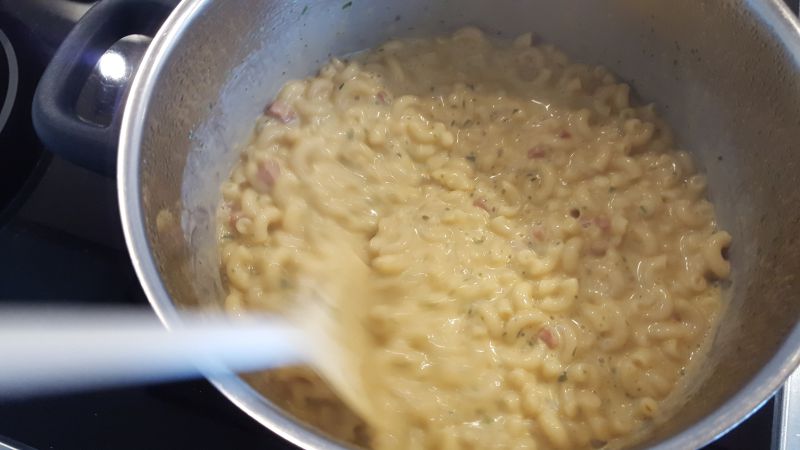 Die Zubereitung des Schinken Hörnli Hüttenschmaus ist wahrlich kinderleicht. 500ml kaltes Wasser in einen Topf oder hohe Pfanne geben, Tüteninhalt dazu und unter ständigem Rühren zum Kochen bringen. Nach dem Aufkochen den Hüttenschmaus ca. 6 Minuten bei mittlerer Stufe weiter kochen bis die gewünschte Sämigkeit erreicht ist. Dabei ab und zu umrühren und fertig ist er der Schinken Hörnli Hüttenschmaus für angeblich 2 Personen, nein sorry, für 2 Portionen. Das ist gleich mal der erste kleine Kritikpunkt, die Menge. Es steht zwar klar 2 Portionen drauf aber die von Knorr bemessen hier eine Portion mit nur 270g und das ist schon sehr wenig. Knorr lügt zwar hier nicht aber beinahe jeder der 2 Portinen liest wird denken damit sind 2 Peronen gemeint, bzw. 2 Personen werden damit einigermaßen satt. Dem ist definitiv nicht so. Der Komplette Hüttenschmaus macht allerhöchstens eine hungrige Person (einigermassen) satt und nicht Zwei.