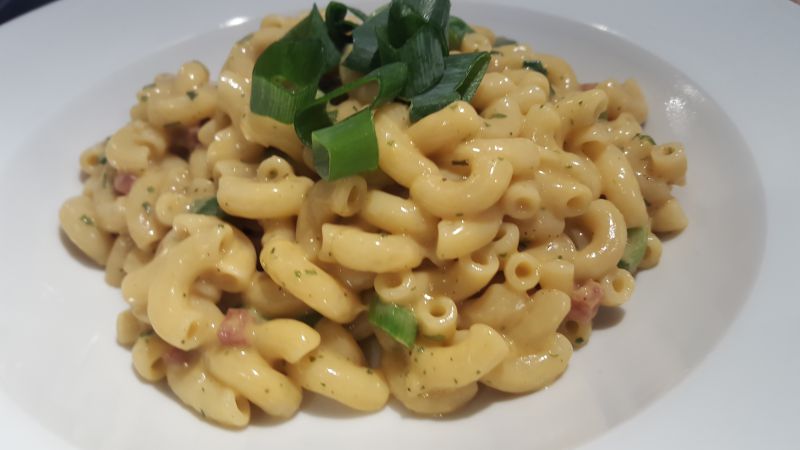 - Geschmack – Da wir ja die frischen Frühlingszwiebel mit an die Schinken Hörnli gegeben haben war unser erster Geschmackseindruck natürlich sehr Zwiebellastig. Was ja nicht schlecht ist aber jetzt NUR noch über den Geschmack des eigentlichen Fertiggerichts zu urteilen wird dadurch schwieriger. Man hat beim Genuss einen sehr sahnigen Geschmack im Mund mit einem Hauch von Schinkengeschmack. Ja und das ist ein klarer Kritikpunkt: Der Schinken! Wie heißt der Hüttenschmaus nochmal? Ja genau, der heißt „Schinken-Hörnli„. Also warum dann nur so einen extrem dezenten Hauch von Schinkenaroma? Überhaupt ist in dem fertigen Gericht kaum Schinken zu finden. Ein paar einzelne Schinken Würfelchen findet man dann doch. Auch kein Wunder bei zur 1,5% an Schinkenanteil laut Zutatenliste. Da geht definitiv mehr liebe Knorr Entwickler! Alles in allem überwiegt der sahnige Geschmack – und natürlich der der Frühlingszwiebel, sofern man diese dazu gegeben hat.