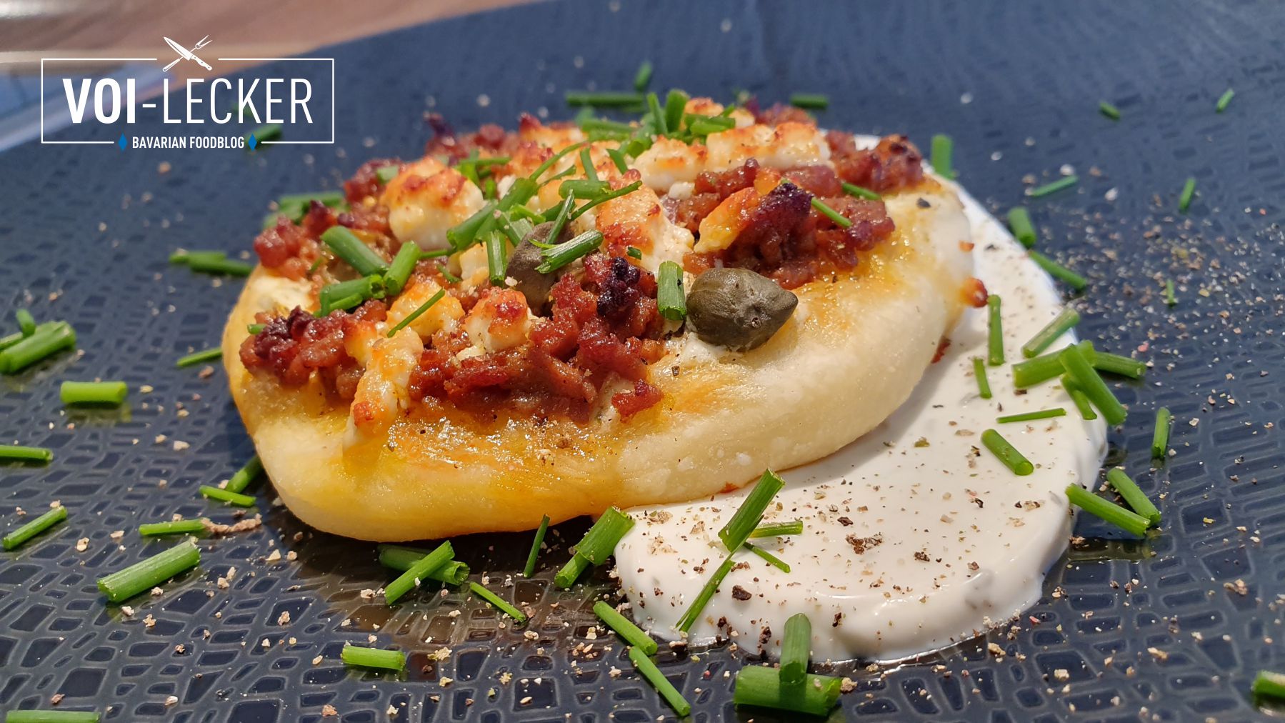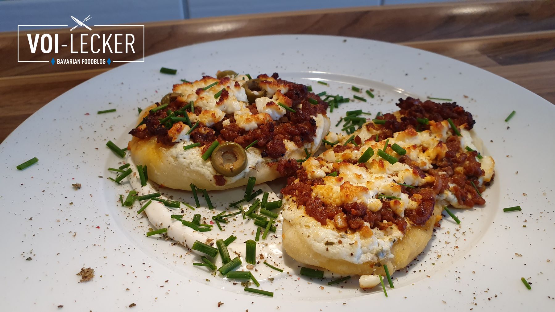 Jetzt den Backofen auf 220 Grad Ober- und Unterhitze vorheizen. Die Teigkugeln mit dem Handballen zu kleinen Pizzen platt drücken und mit etwas Schmand bestreichen. Darauf dann etwas von der Zatar Hackmischung geben, ein paar Kapern und Olivenringe und mit Schafskäse bestreuen. Die Manakish backe ich dann etwa 8 bis 10 Minuten bis der Schafskäse halt anfängt Farbe zu bekommen.