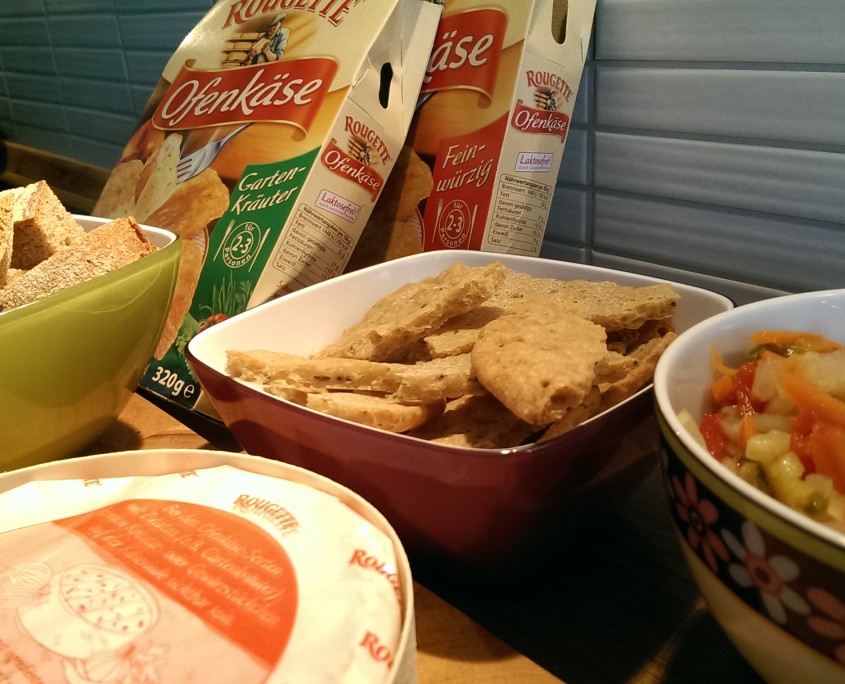 Tja wia gsogt sollte man den Ofenkäse natürlich nicht nur PUR essen, wobei das natürlich auch möglich ist. Am besten is es wenn man wie bei einem Käse Fondue verschiedene Zutaten in den warmen Käse taucht. Was man da jetzt „reintunkt“ is natürlich jedem selber überlassen, wir nehmen neben ganz normalen Brotwürfel (kann locker auch ein paar Tage altes Brot sein!) eigentlich immer auch das extrem knackige Schüttelbrot. Mmmmh ist wirklich ein Genuss, probiert´s es einfach amoi aus. Als weitere Beilage findn mia an Puszta-Salat, Paprika, Tomaten oder auch MixedPickels. Wer möchte kann mit Chili schärfen oder mit anderen Gewürzen spielen.