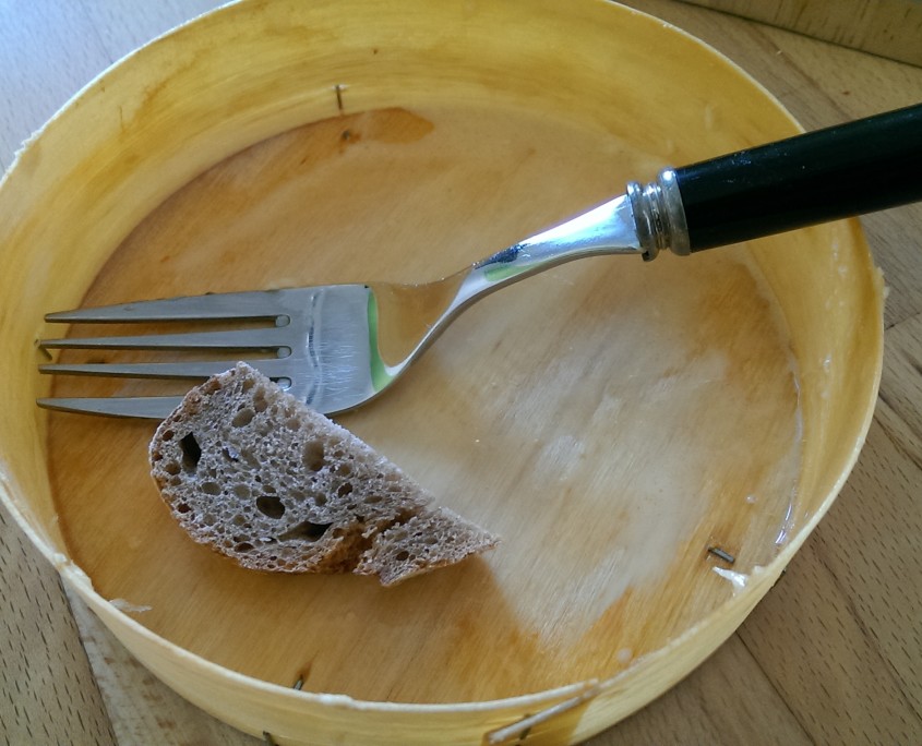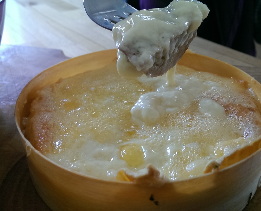 Natürlich wird der Ofenkäse einfach im Ofen aufgewärmt, allerdings mit einem kleinen Break. Der Ofenkäse in der Holzschale kommt in den vorgeheizten Backofen und muss da erst einmal ca. 10 Minuten verweilen. Wenn die Oberfläche anfängt sich leicht zu wölben muss man den Ofenkäse kurz raus nehmen und kreuzförmig einschneiden. Die 4 Ecken klappt man einfach über den Rand hinaus (Diese Randecken werden übriegens zum Schluss extrem knusprig und zu wahren Streitobjekten am Essenstisch). Dann stellt man den Ofenkäse für weitere 10 Minuten in den Backofen und fertig ist das „Mini-Käse Fondue„. Als Mini ist der Ofenkäse aber jetzt wirklich ned zu bezeichnen. Je nachdem mit was man den Käse ist machen die 320g Ofenkäse definitiv einen Erwachsenen satt. Man kann deshalb locker von einer Hauptmahlzeit sprechen, bzw. von einem Hauptbestanteil einer solchen 🙂