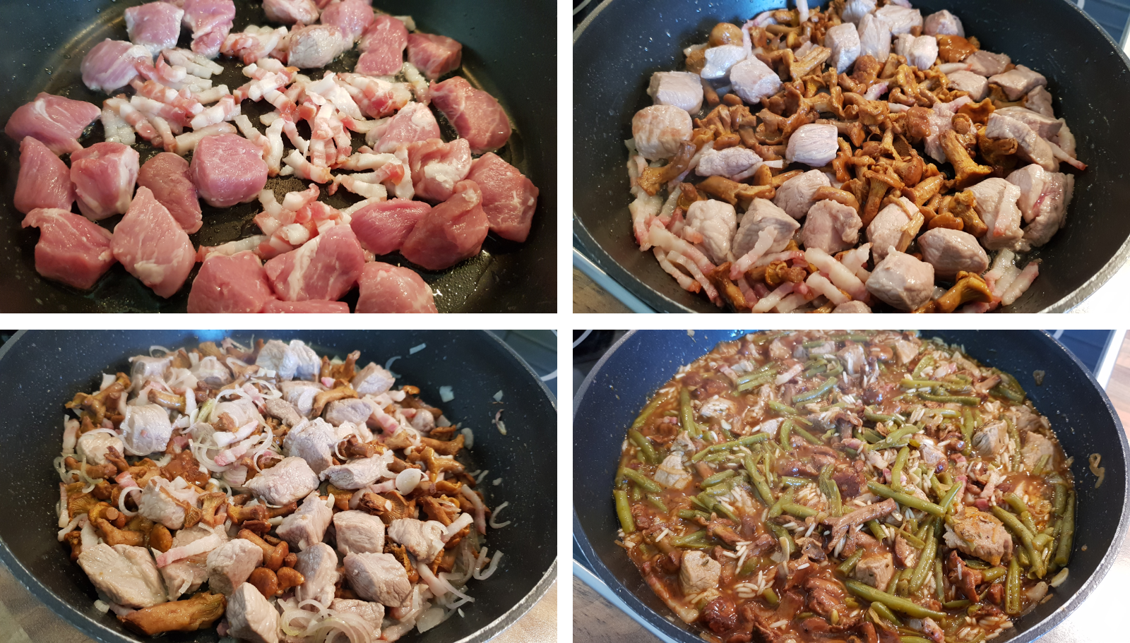 Und so einfach machen wir in einer Pfanne das Reisfleisch mit Bohnen und Pfifferlingen