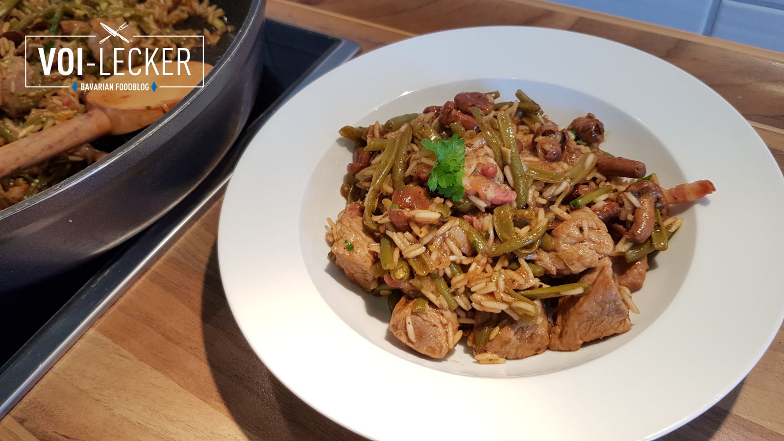 Rezept für Reisfleisch mit Pfifferlingen, Bohnen und Speck. Hierbei handelt es sich um ein One-Pot-Gericht welches man schnell und einfach in einer Pfanne, oder Schmortopf, zubereiten kann. Wie bei allen One-Pot Gerichten ist es auch hier sehr wichtig das man sich genau an die Mengenangaben und Zubereitungsschritte hält damit auch alles am Schluss gleichzeitig gar ist. Wir haben für unser Reisfleisch Pfifferlinge verwendet, sollte es diese nicht geben kann man auch genauso gut Kräuterseitlinge oder Champignons verwenden. Besser sind allerdings schon Kräuterseitlinge oder eben Pfifferlinge, weil diese kräftiger im Geschmack sind.