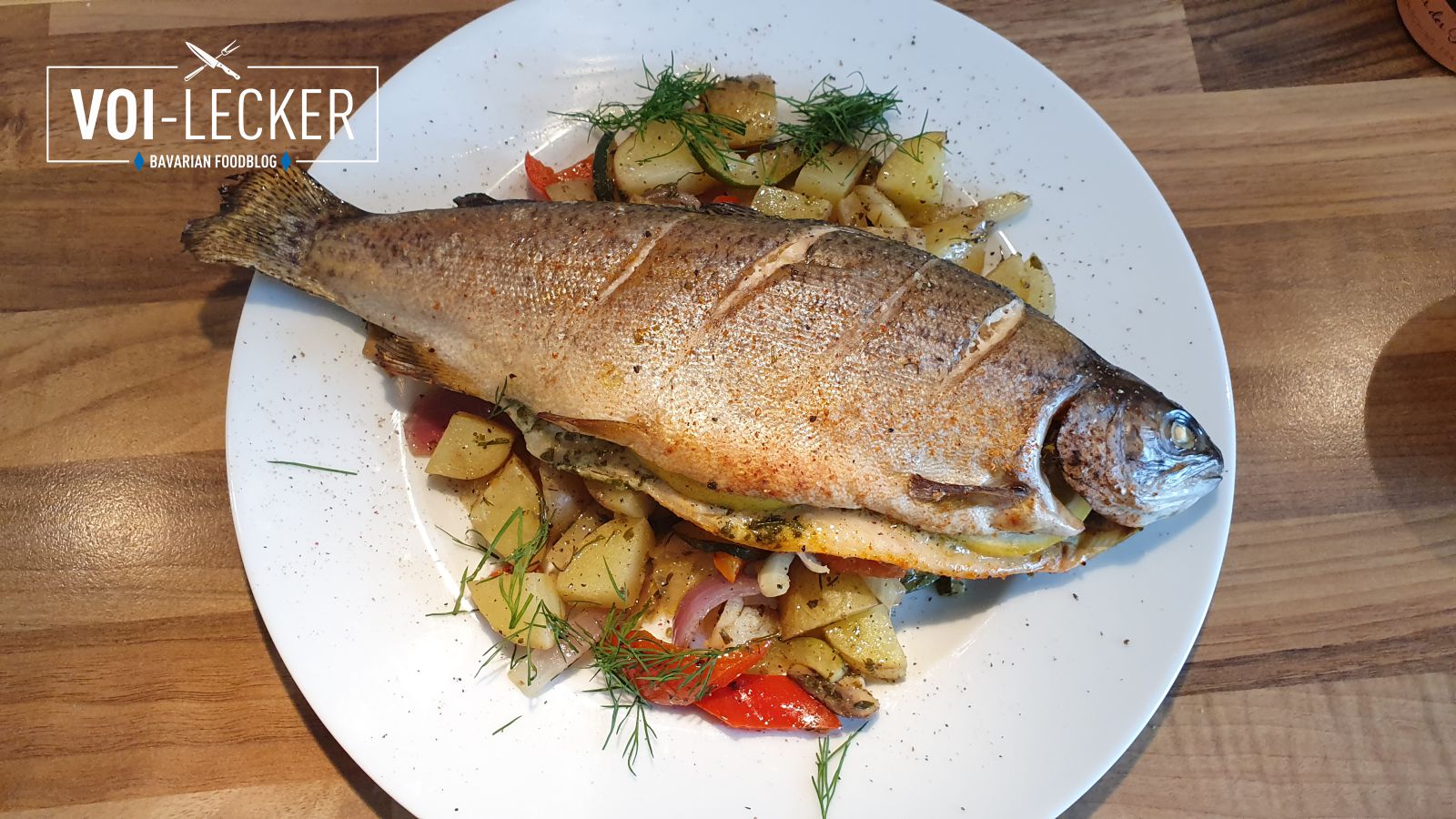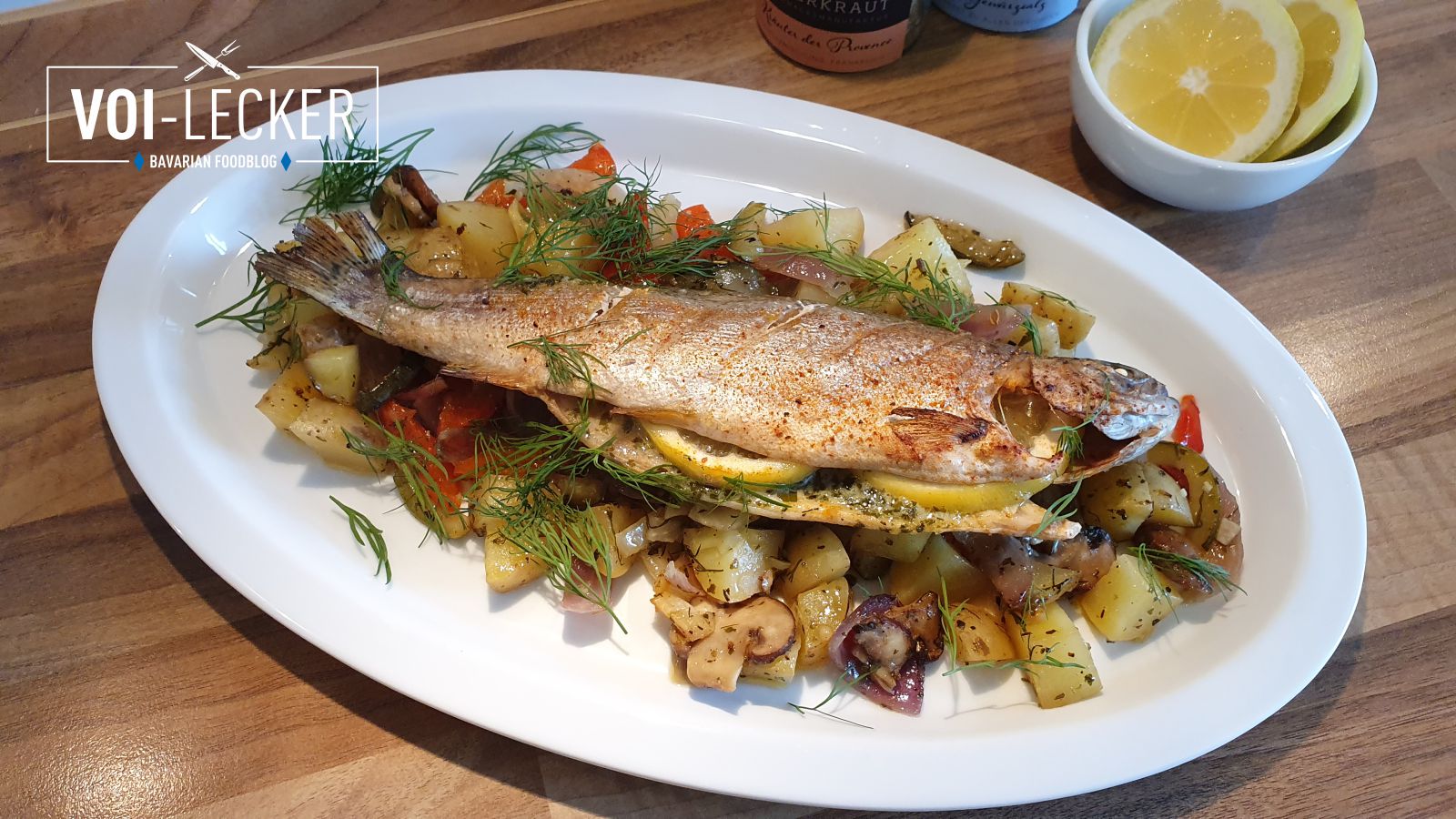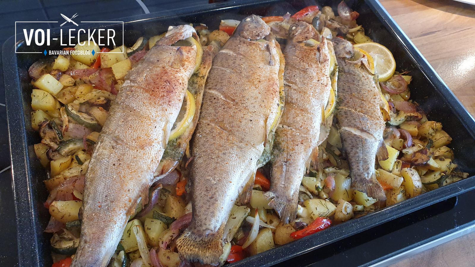 Backofen Forellen auf Gemüsebett ist mein heutiger Rezeptvorschlag für euch. Auf die Idee kam ich vor ein paar Wochen als es Backofen Hendlhaxen auf Gemüsebett gab. Beim Genuss dieses Gerichtes sprachen wir schon darüber das sich auf dem Gemüse auch ein Fisch gut machen würde. Und als es gestern an der Tür klopfte und mir mein Schwager 4 Regenbogenforellen brachte war klar was ich daraus machen würde. Leckere Backofen Forellen auf Gemüsebett.