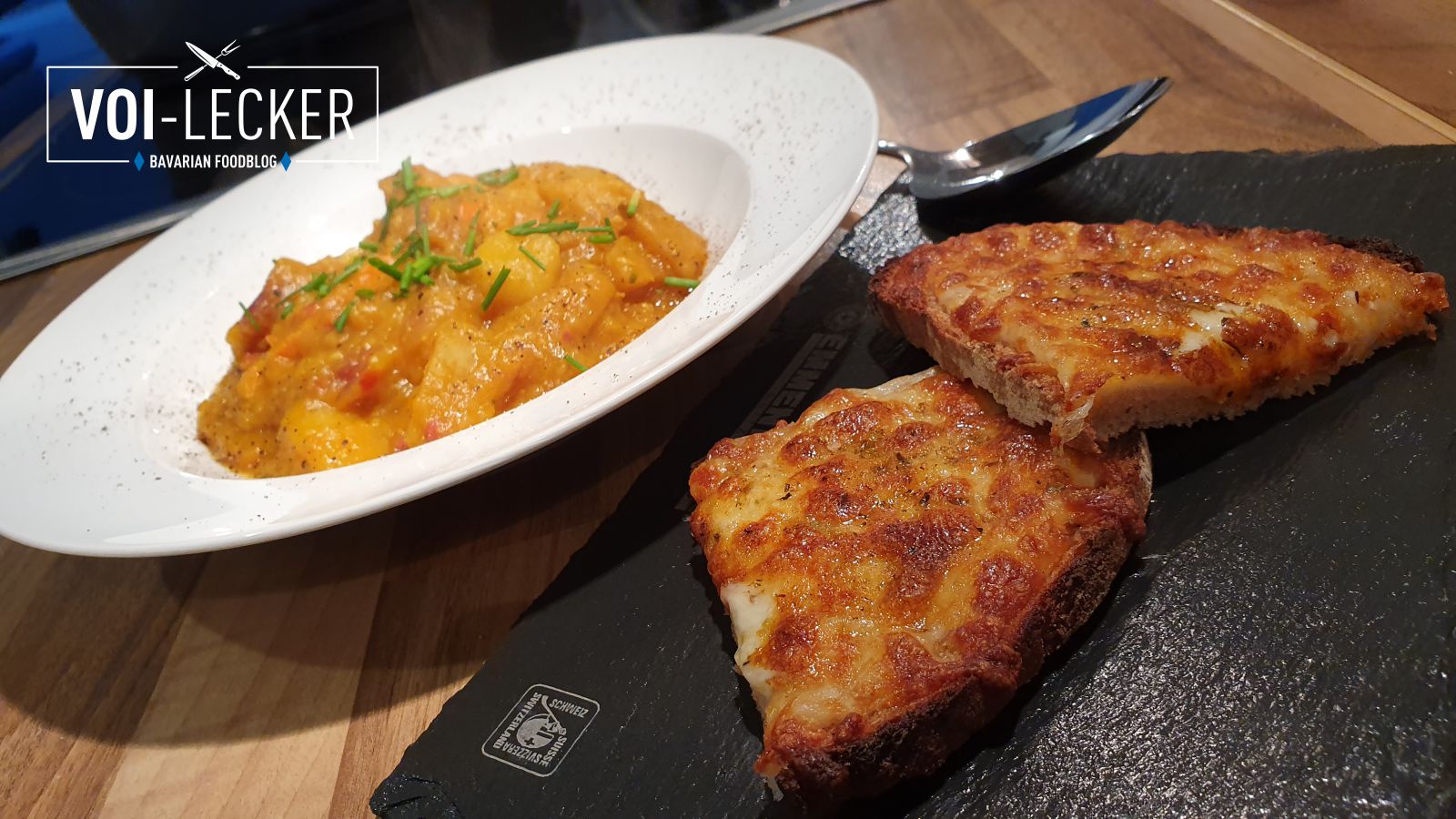 In einem Topf (oder hohe Pfanne) die Gemüsemischung sehr scharf anbraten. Es dürfen gerne ein paar Röstaromen entstehen ? Nach 3-4 Minuten mit Gemüsebrühe ablöschen und mit geschlossenem Deckel etwa 1 Stunde bei mittlerer Hitze einkochen. In der Zwischenzeit kann man sich eine Beilage machen. Wir haben uns dazu einfach ein paar Scheiben Bauernbrot mit Emmentaler Käse überbacken. Passt wunderbar dazu.