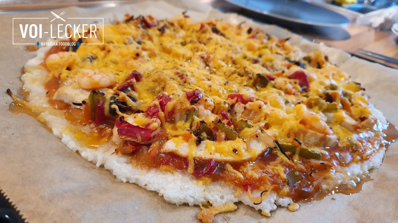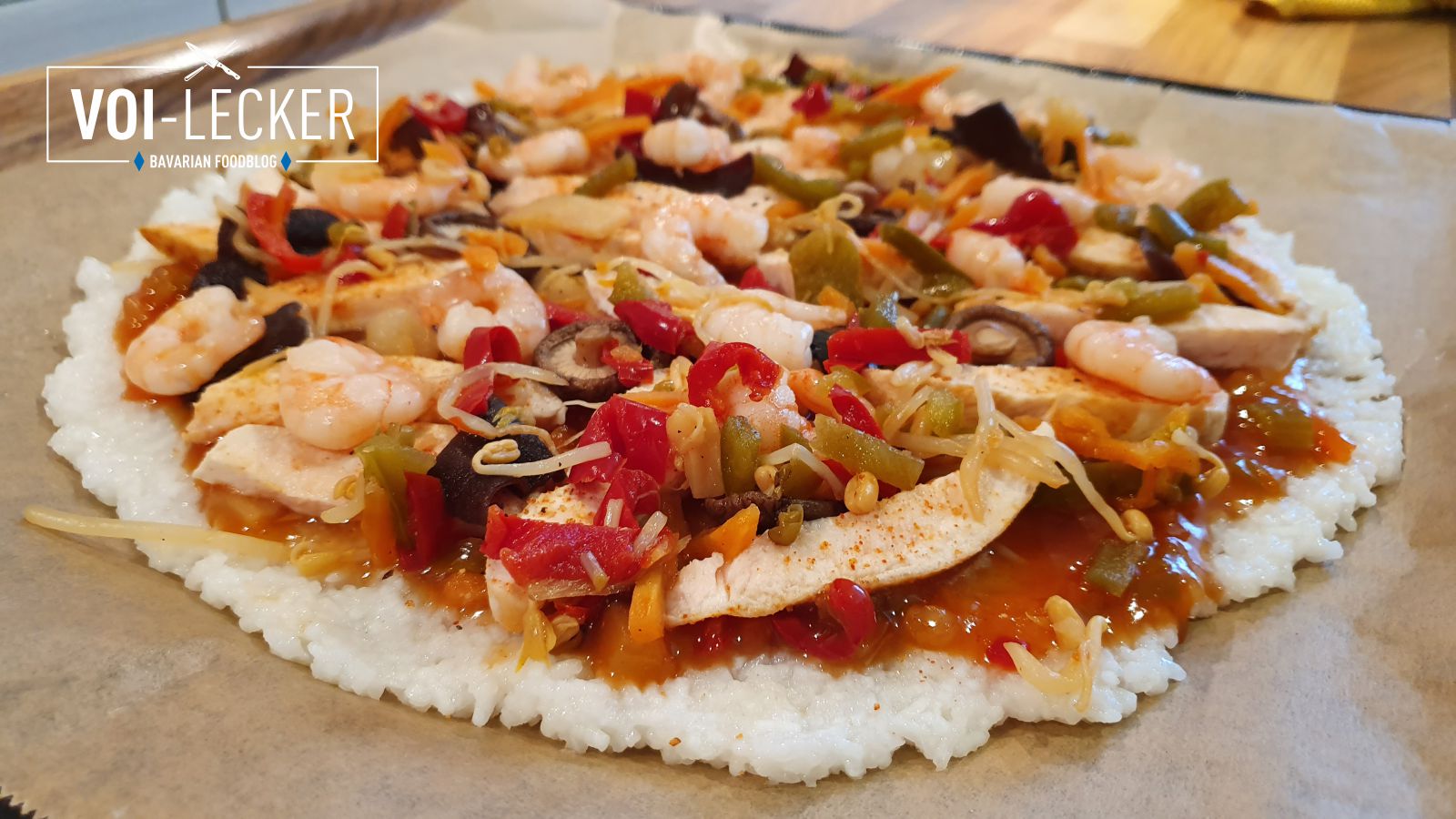 Reis-Pizza „Chinatown“. Mit Hähnchenbrust, chinesischem Gemüse & Garnelen