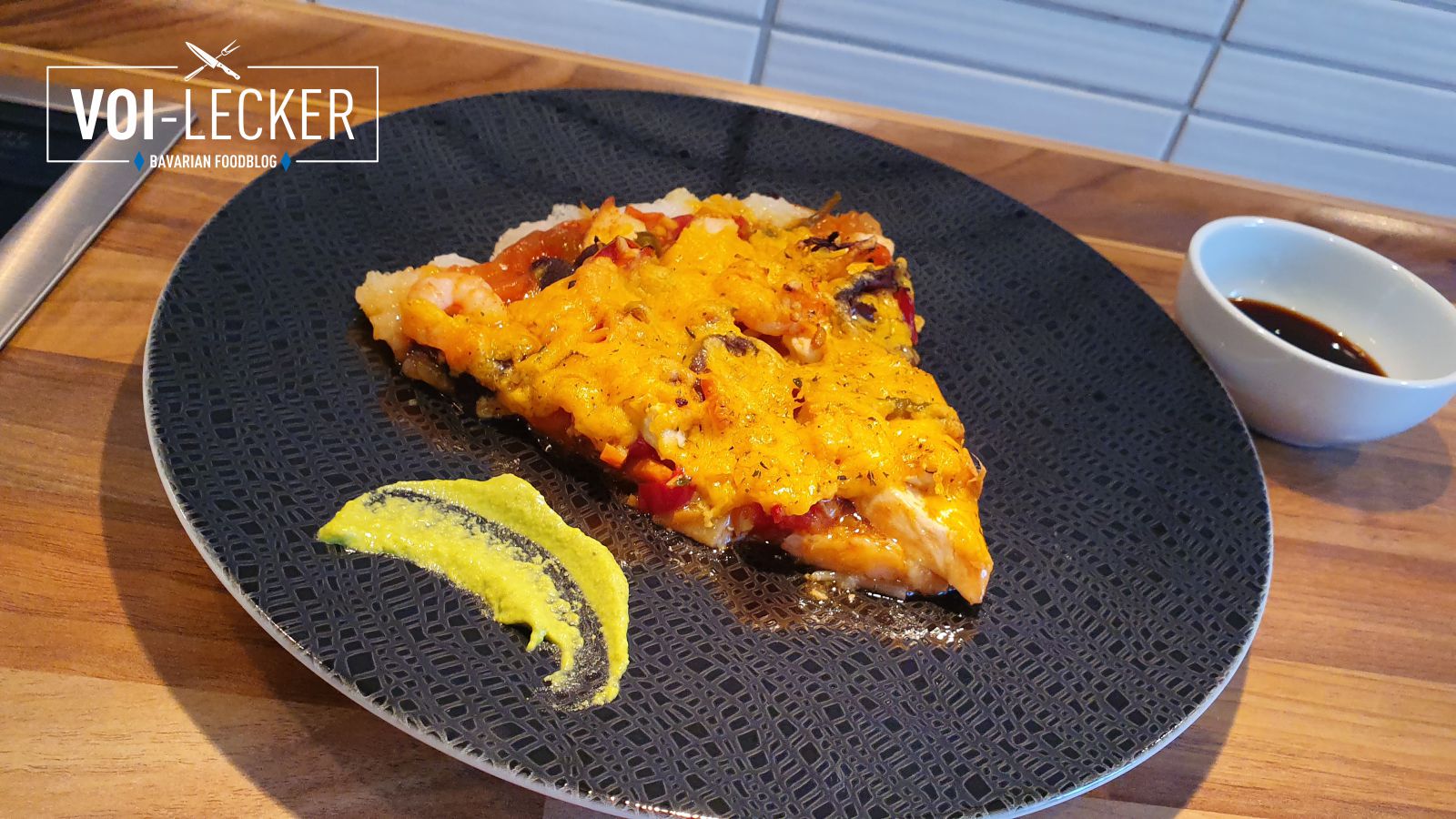 Auf den Reis-Pizza Boden kommt dann als erstes die süßsaure Sauce. Darauf verteilt man dann die verschiedenen Zutaten. Etwas Sojasauce darüber tröpfeln und mit Kreuzkümmel würzen. Wer Käse liebt streut final noch etwas Cheddar drüber. Die Reis-Pizza im vorgeheizten Backofen bei 220 Grad (Ober- und Unterhitze) 15-20 Minuten fertig backen. Mit etwas Sesamöl betröpfeln und nach Bedarf mit Wasabi-Paste und Sojasauce servieren.