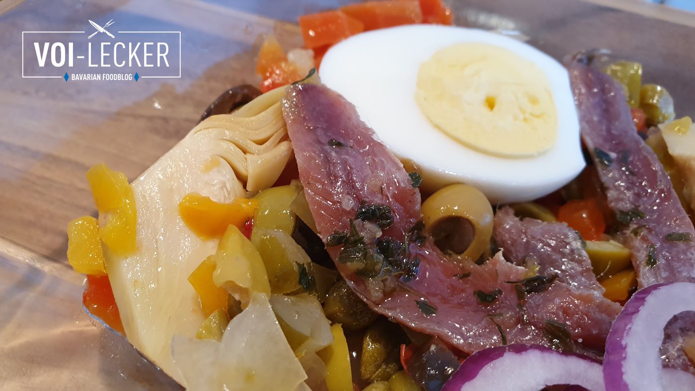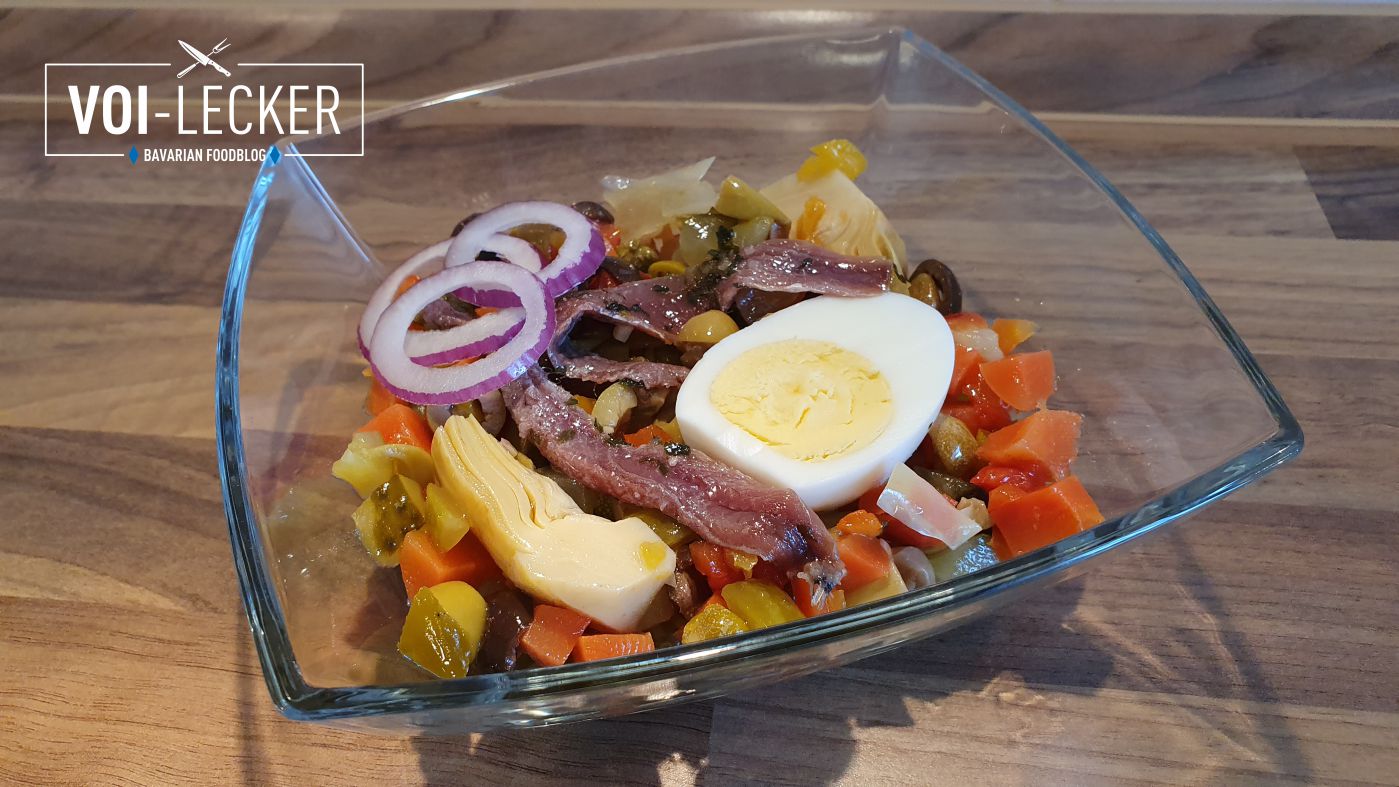 Paprika, Essiggurken, Oliven, Schnittlauch und Karotten in kleine Würfel schneiden. Die Karotten koche ich immer etwas vor damit dir nicht so extrem knackig sind. 1,5 Zwiebeln ebenfalls sehr klein hacken, eine Hälfte in Ringe schneiden. Alles in einer Schüssel verrühren und schon mal mit Salz, Pfeffer, Basilikum und einem Spritzer Essig würzen. Die Gemüsemischung nun in die Sülzebehälter füllen und dabei immer wieder Sardellenfilets mit einschichten. Oben ein halbes gekochtes Ei mit „einbauen“ und Zwiebelringe optisch schön platzieren.