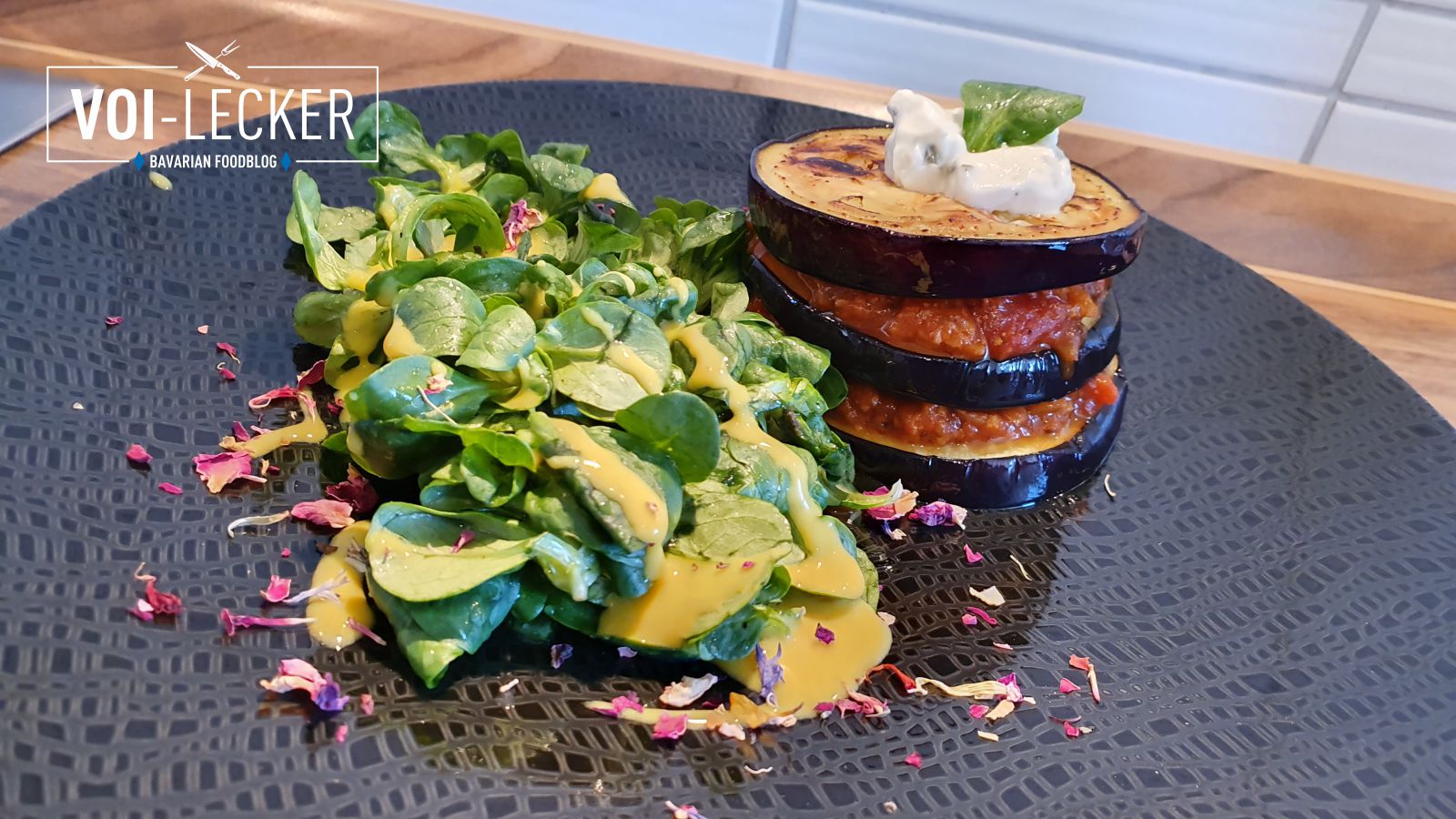 Welches Gericht ich als erstes nachkoche war eine schwere Entscheidung. Ich habe mich dann aber für die Auberginentürmchen entschieden. Schon allein deshalb weil ich Bolognese liebe und ich unbedingt die vegetarische Bolognese mit Blumenkohl testen wollte. Leider konnte ich das Rezept nicht 1:1 nachkochen da ich keine Tahini (Sesampaste) hatte. Ich habe stattdessen SourCreme mit Schnittlauch verwendet. Und den Rucola habe ich durch Feldsalat ersetzt. Zusätzlich gab´s bei mir noch ein Honig-Senf Dressing.