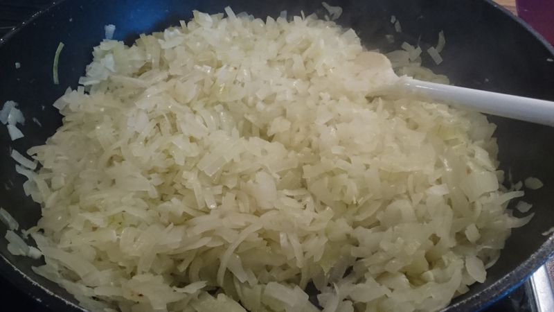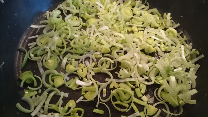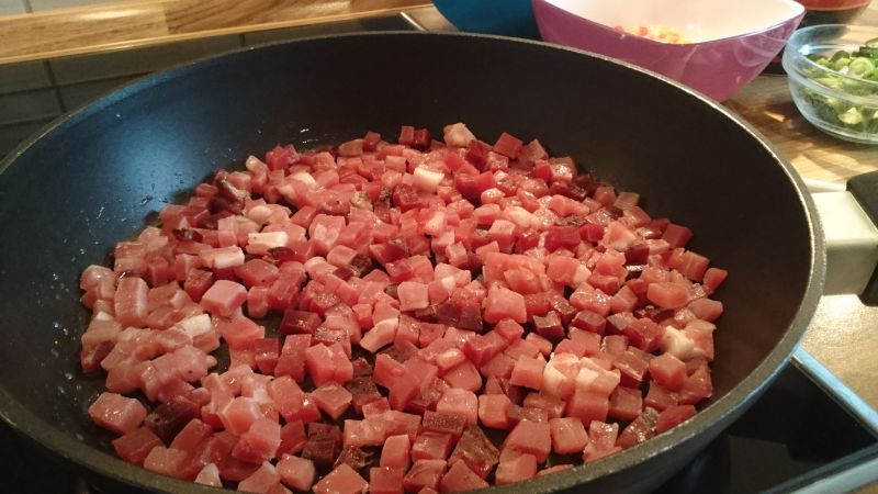 Taucherbrille auf uns los geht´s mit Zwiebel schneiden 🙂 Klar ist die Schnippelei der erste von nur zwei Schritten zu einem leckeren Zwiebelkuchen. Also erst einmal die Zwiebel und den geräucherten Schinken in kleine Würfel schneiden. Lauch und Frühlingszwiebel in Ringe schneiden. Wenn das geschafft ist dann geht´s an die Pfanne. Erst die Schinkenwürfel leicht anbraten und danach raus aus der Pfanne in eine große Schüssel geben. Dannach die Zwiebel glasig anschwitzen (nicht braun werden lassen) und ebenfalls in die Schüssel zu den Schinkenwürfel. Dann die Lauchringe nur ganz kurz durch die Pfanne schwenken und auch in die Schüssel geben. Das wars mit Pfanne schwenken. Nun unbedingt gute 30 Minuten warten bis alles gut abgekühlt ist.