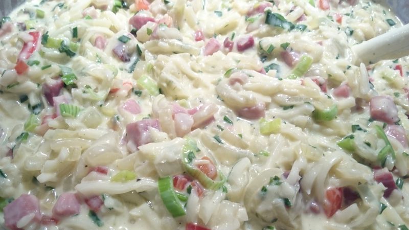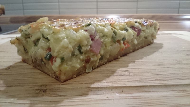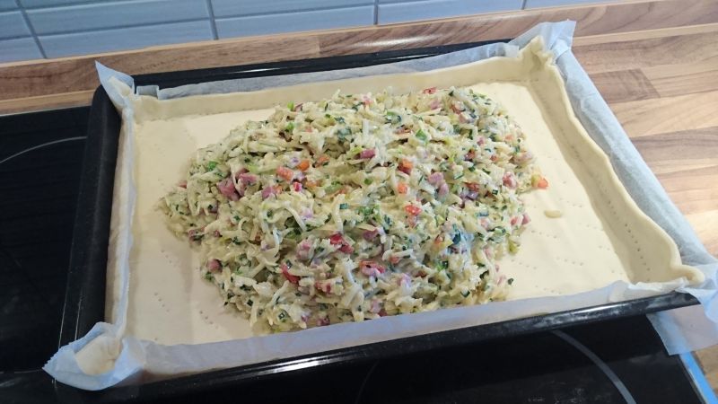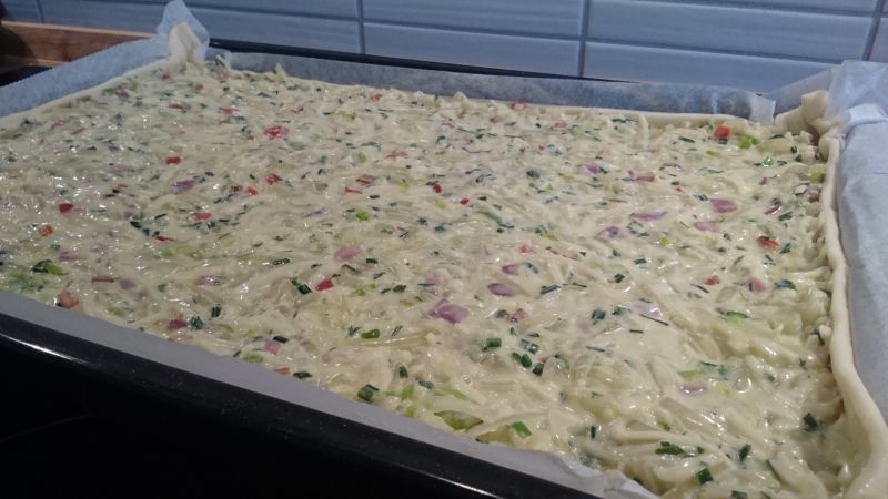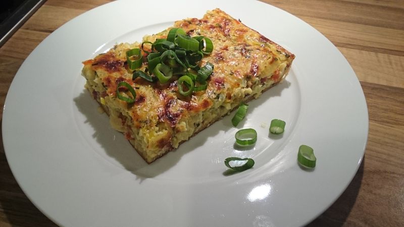 Je nachdem wie gut man mit dem Messer umgehen kann braucht man zum Schneiden der Zwiebeln, Frühlingszwiebel, des Lauchs, Schinken und der Paprika gute 30 Minuten. Dazu kommen etwa 15 Minuten für das Anbraten des Ganzen. Dann sollte man nochmal gute 30 Minuten einplanen für das Abkühlen, Zusammenrühren und für die Backvorbereitung. Backzeit selbst: 40 Minuten bei 200 Grad