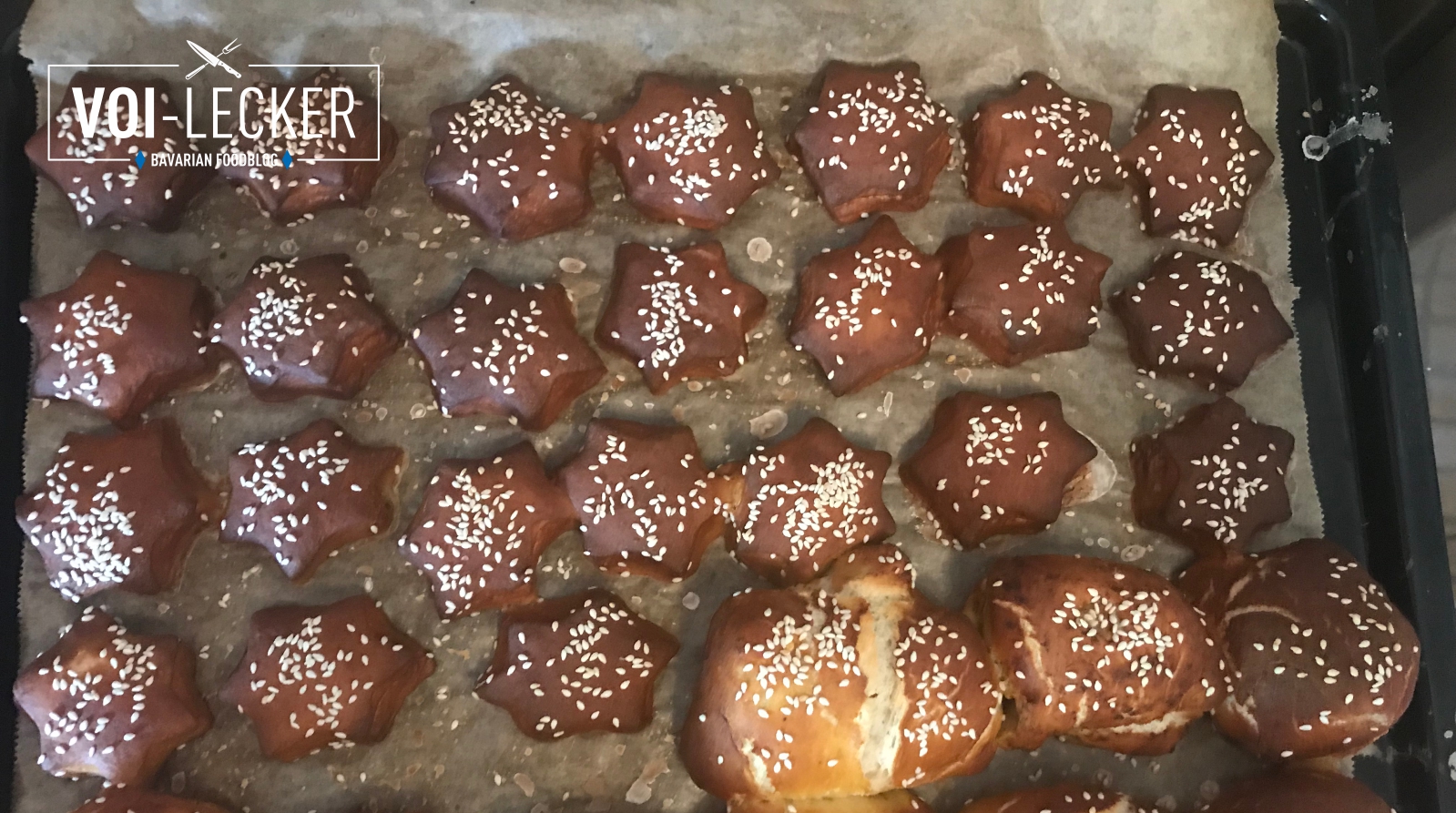 Danach die Weißwürste im Brezenteig sowie die Laugenkonfekt-Sterne auf ein mit Backpapier ausgelegtes Blech legen und bei 200 Grad Unter-/Oberhitze 15 bis 20 Minuten backen. Aus dem Rest des Teiges hab ich Sterne ausgestochen und Laugenkonfekt draus gemacht, sieht gut aus, schmeckt VOI lecker und kommt nicht nur bei Kindern gut an.