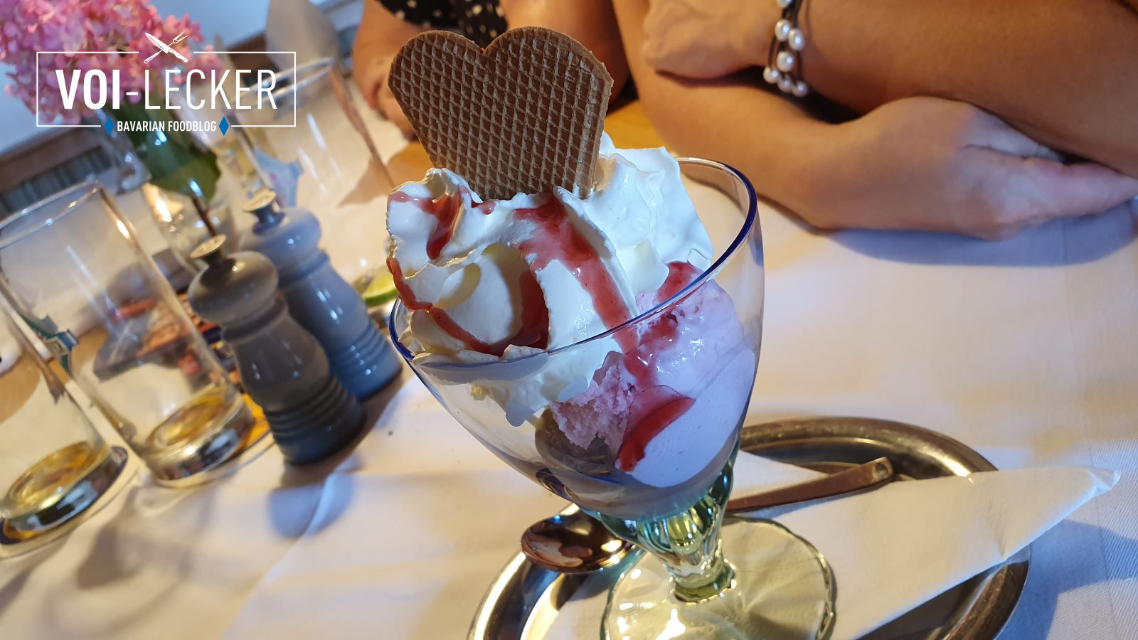 Als Dessert bei unserem Besuch im Wild-Berghof Buchet bestellten wir uns ein gemischtes Eis mit Sahne. Leckeres Schoko-, Vanille- und Erdbeereis mit Sahne und Keks. Ein Dessert-Klassiker der immer geht. Auch im Berghof Buchet. Lecker.