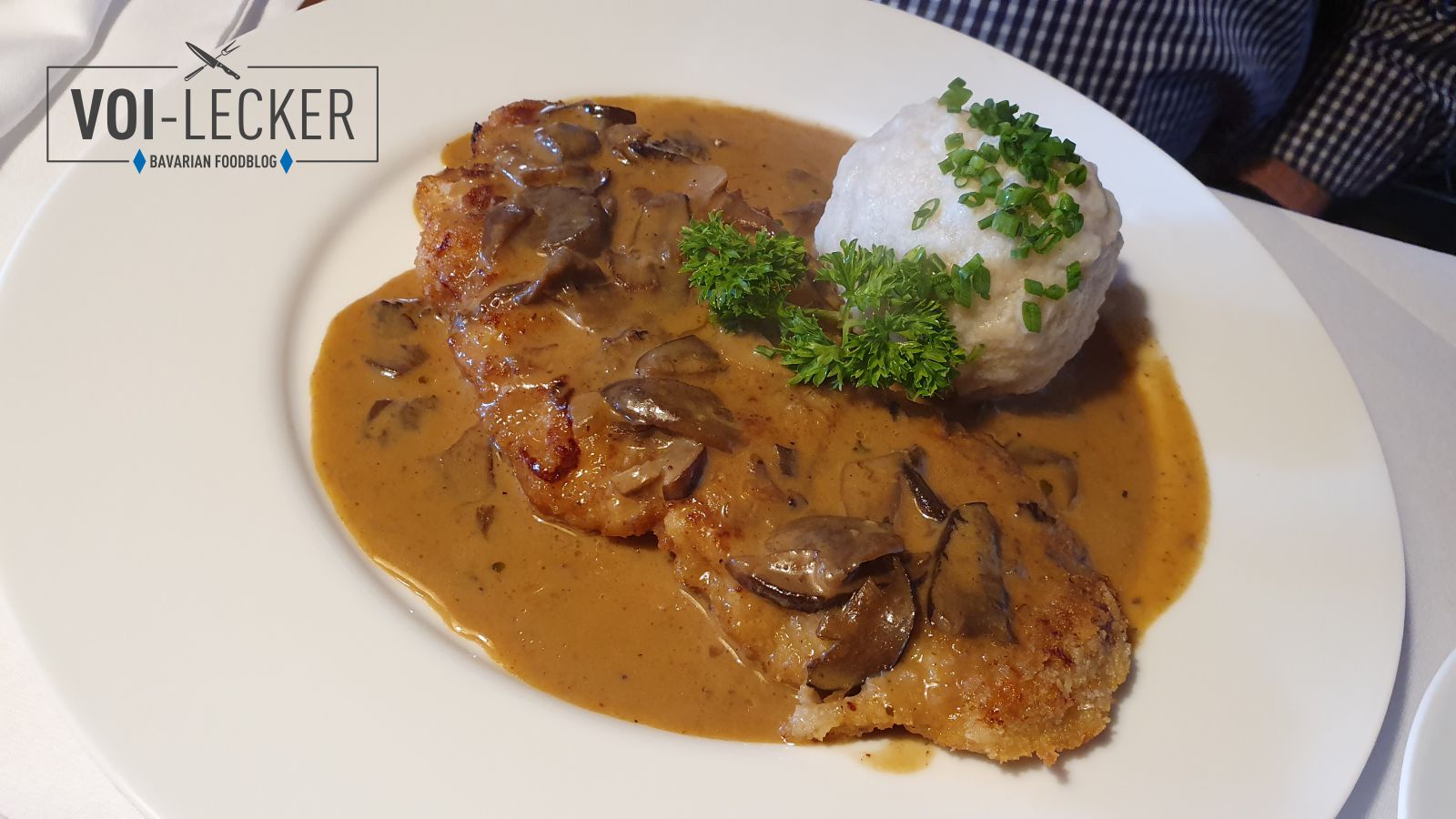 Paniertes Schweineschnitzel mit Schwammerlsoße und Semmelknödel. Auch bei dem Gericht waren wir vollkommen begeistert. Das Schnitzel absolut TOP, dazu aber gleich mehr beim eigentlichen Schnitzel. Die Schwammerlsoße sehr cremig und mit einem frischen Pilzgeschmack. Passt perfekt zu dem Schnitzel. Der Semmelknödel ist auch passend, weil a gschmeidige Schwammerlsoße schreit ja irgendwie nach Knödl, oder?